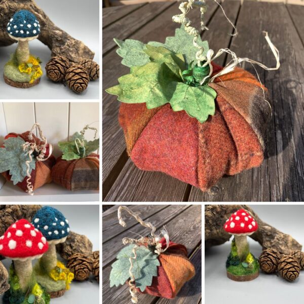 “Autumn Treasures” will be a day of fun and frolics with 2 workshops to fuel your creativity. You will make these delightful tweed & textile pumpkins with me and gorgeous 3D toadstools with needle-felting expert Mo Parker. Everything is included for your fun-filled day and we will also provide you with a delicious afternoon tea style lunch from the award-winning Tudor Farmhouse Hotel.